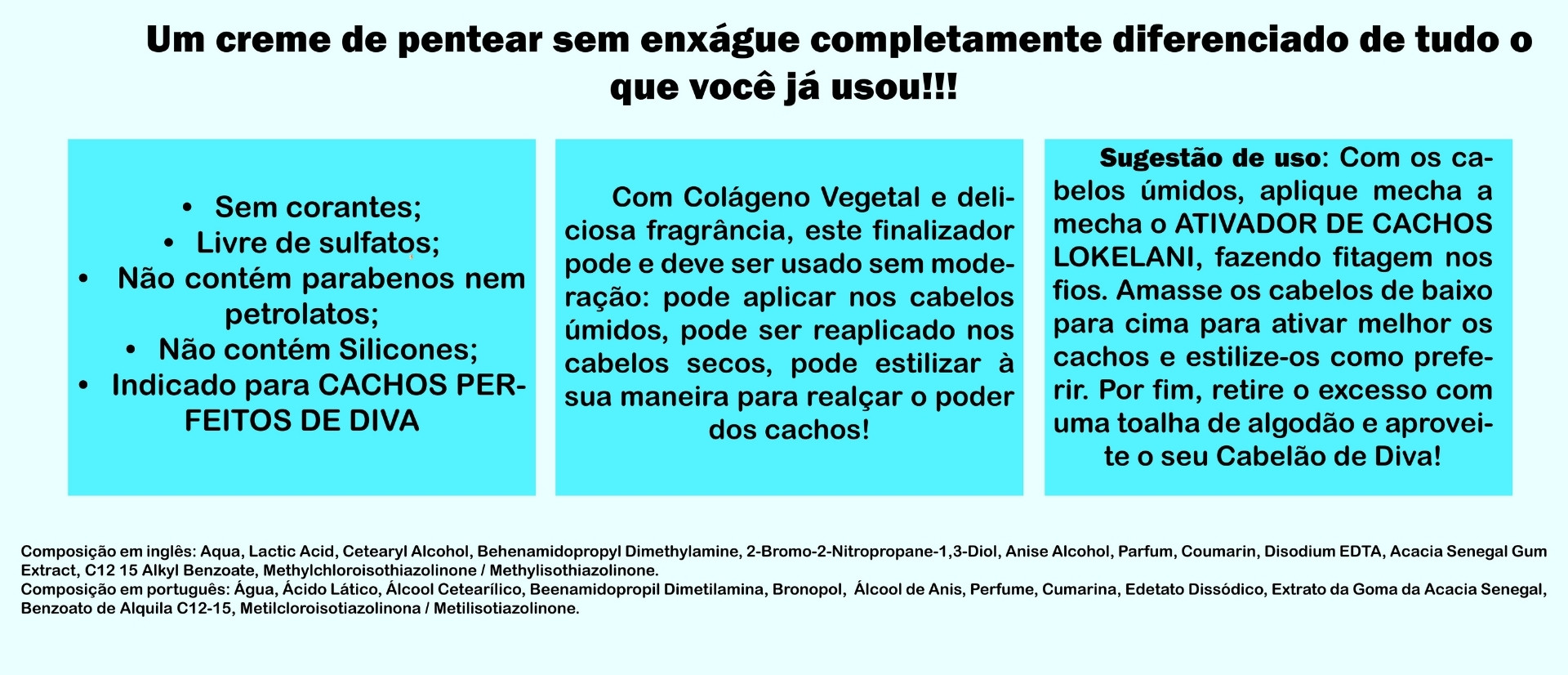 Descrição: Isento de corantes, parabenos, sulfatos e petrolatos, com colágeno vegetal para aumentar a penteabilidade e proporcionar umectação; formando filme modelador de cachos