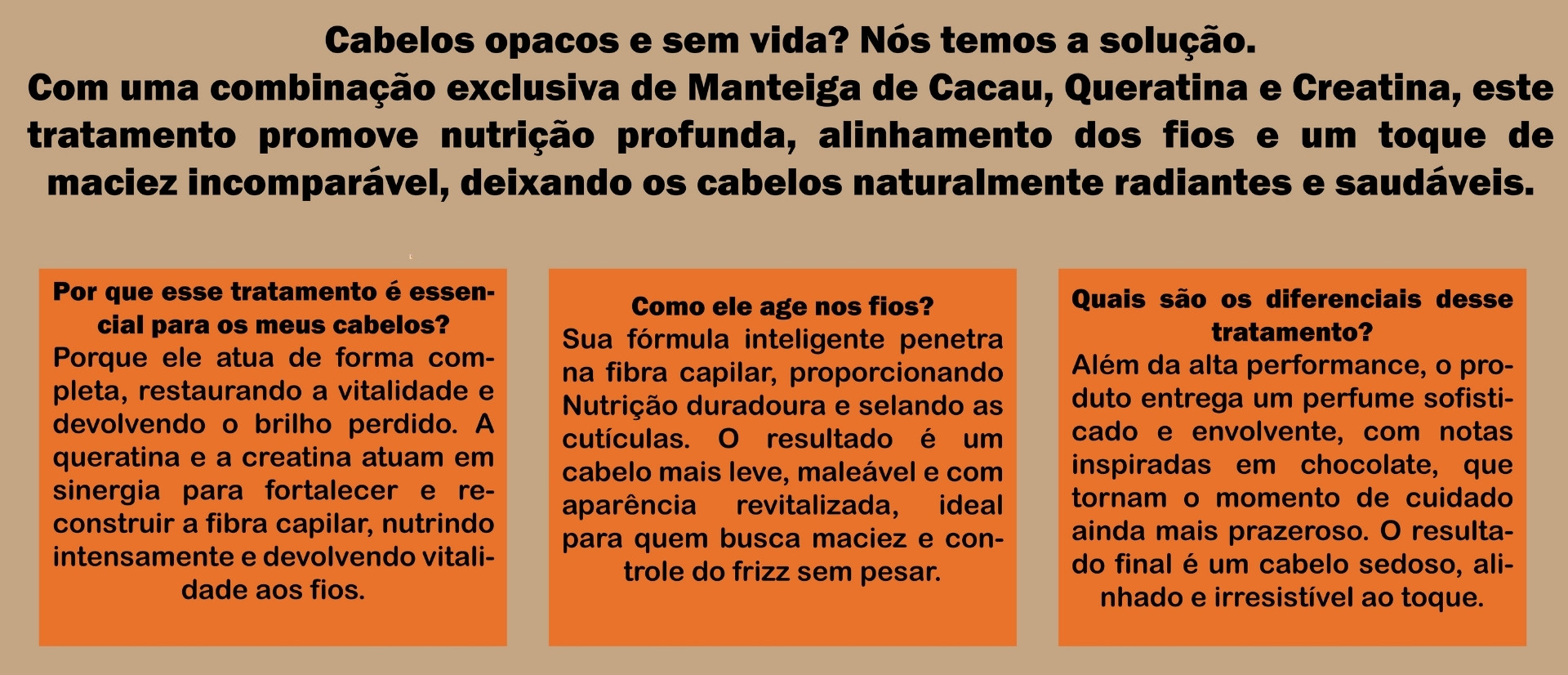 Descrição: Nossa máscara de tratamento de queridinha conta com Queratina, Creatina e com a emoliencia da Manteiga de Cacau para resultados incríveis nutrindo intensamente os cabelos danificados, porosos e armados de maneira eficaz e duradoura!